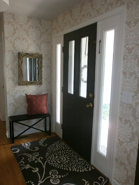 I think it would look fantastic. Ditto the comment to find a sheer linen in the same tones as the wallpaper and I might also consider neutralizing the rug, just so the wallpaper is the main focal point! Also, one of the images has an accent chair in the entry and that would also look good to give you the sense of more space (rather than the bench). Love the idea, can't wait to see how it turns out! M.