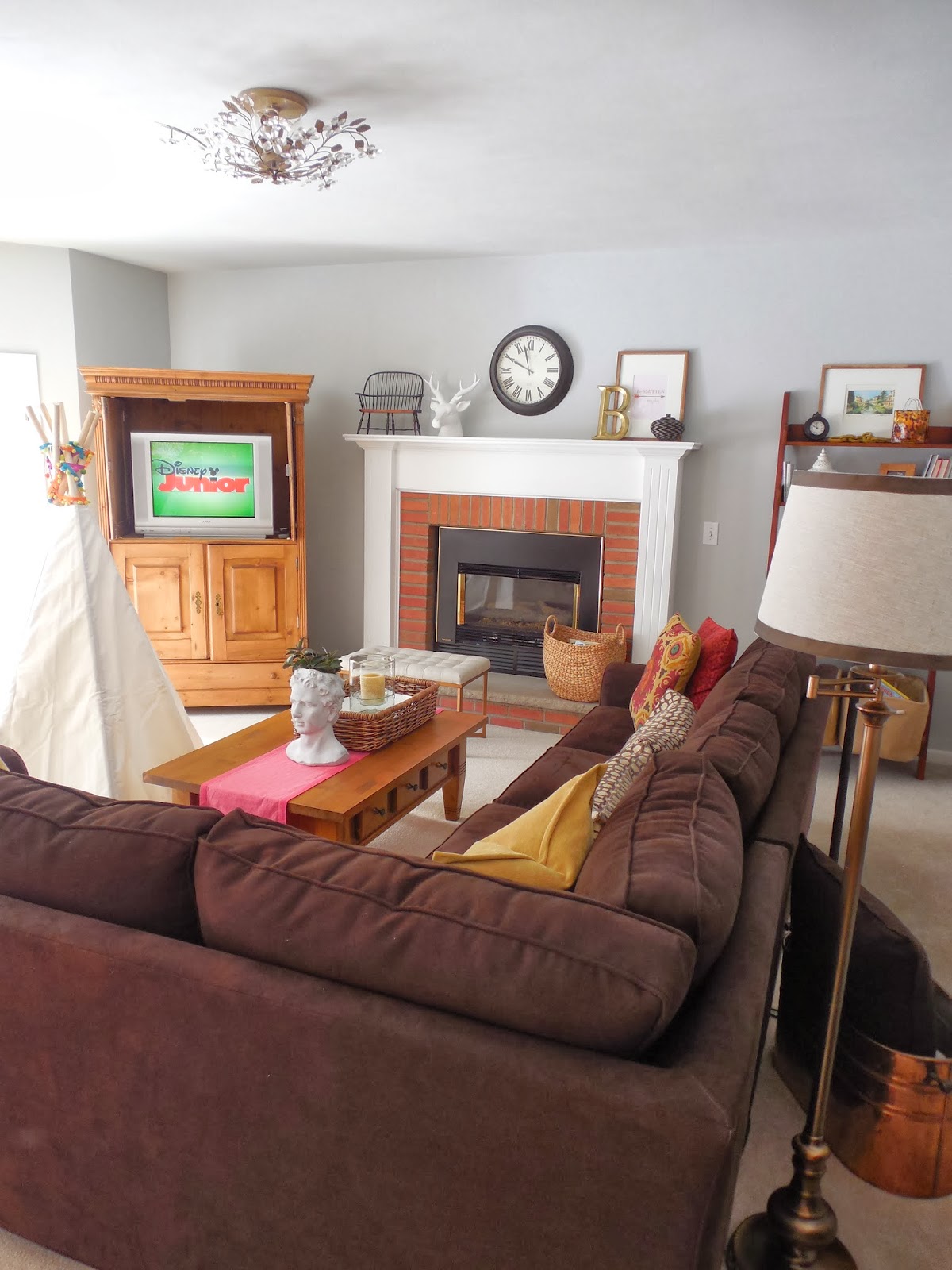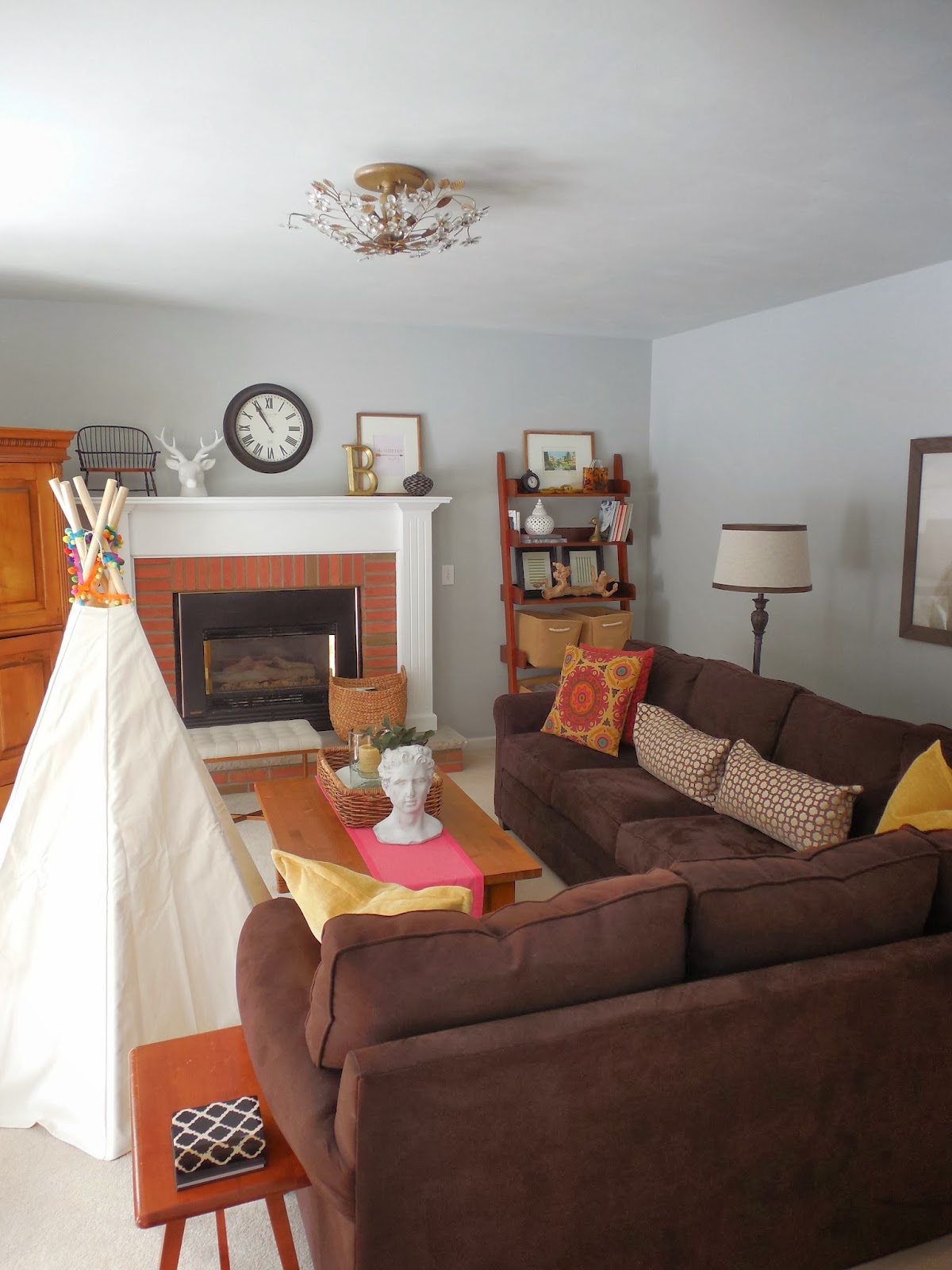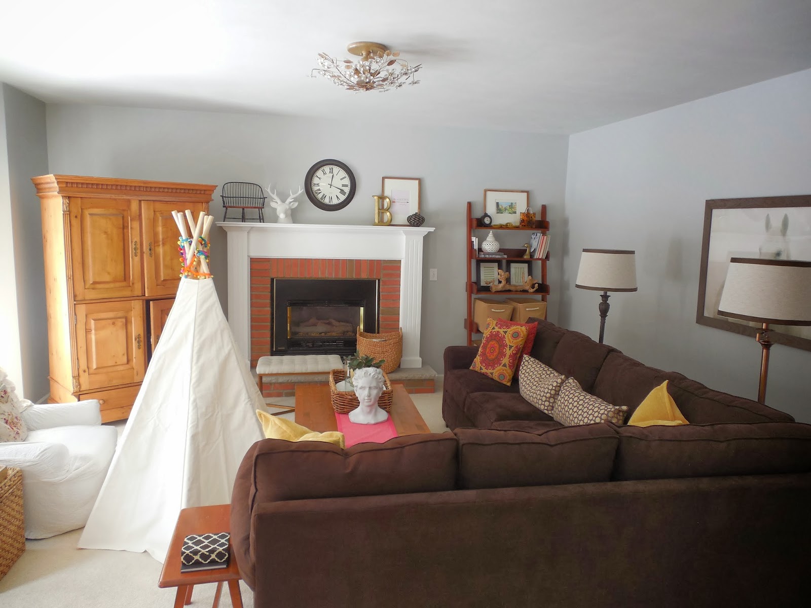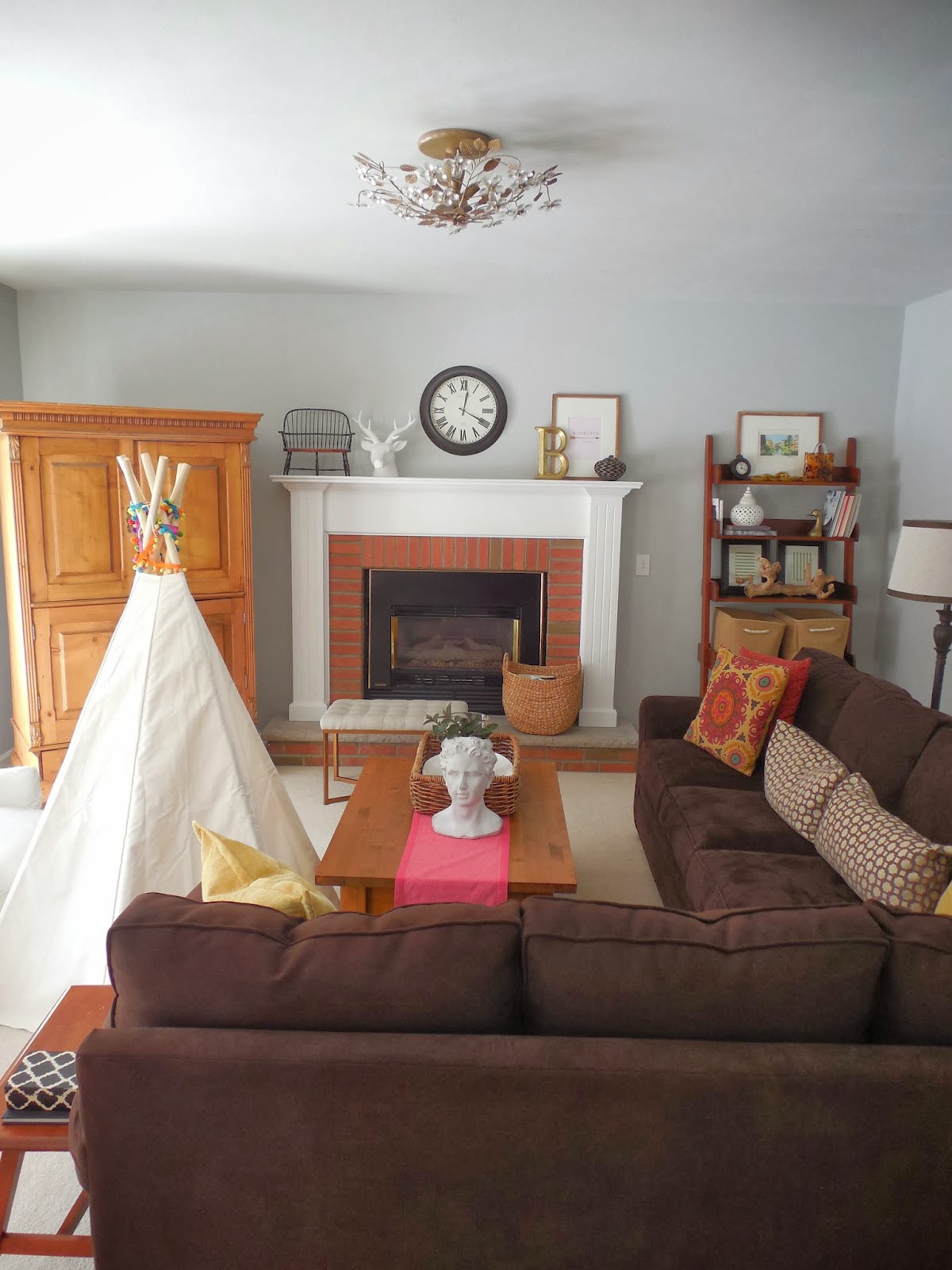 Don’t adjust your screen… this is a new post! Yesterday, I revealed our new tee pee in the finished basement. The kids love it and for now, they have decided that it would be fun to bring it upstairs. They wanted to watch cartoons in it, so it’s now in our family room. I actually think this is a great idea, since the picture quality is so much better to show all of you! That’s probably not what the kiddos had in mind, but works for me and the blog! ๐ So here is the second reveal, in much better lighting, of our new tee pee…
