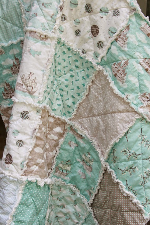 I am excited to introduce a new series to the blog… Check Out This Etsy Shop… Every week, I will highlight a favorite etsy shop of mine and I am kicking off this series with a good friend’s shop! I met Shantelle a couple of years back and she is the sweetest, most genuine person you’ll ever meet! In her shop Just Luved, Shantelle sells handmade rag quilts and other shabby sweet items. She has always loved the vintage appeal that rag quilts have and the originality that comes with a special handmade product. What I love about her shop is the ability to choose from the variety of quilts on her site or you can special order a quilt with the colors and fabric ideas for your space. It is such a meaningful and personal addition to a nursery and would also make a wonderful, thoughtful gift for a baby shower. I decided to take one of my favorite quilts from her shop and build a nursery around the color scheme. Here is the precious quilt…