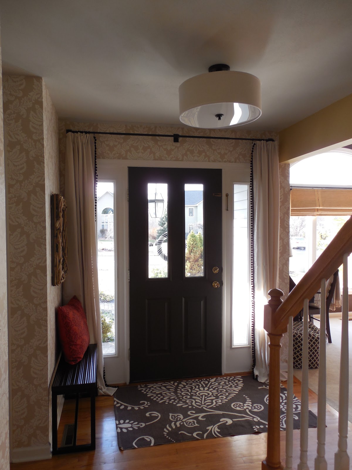 I recently posted about my pom pom fringe curtains, and as I was looking at the pictures, I noticed the bench was now a bit too long. Well, I actually noticed it when seeing it in front of me, but the pictures drove the point home even more. It was time for the bench to go somewhere else in the house and this spot needed a smaller seat. Here is what the foyer looked like about two days ago…