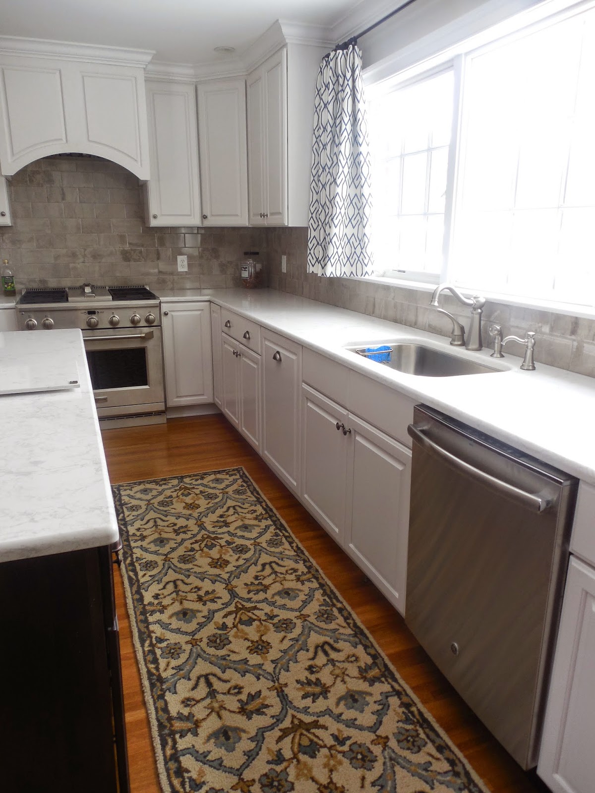 {I had forgotten that the kitchen counters were not in yet, when I started with the design plan. But they had already picked out a gorgeous quartz counter that resembles marble. Perfect choice!!}