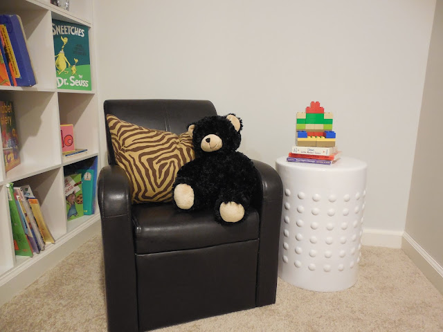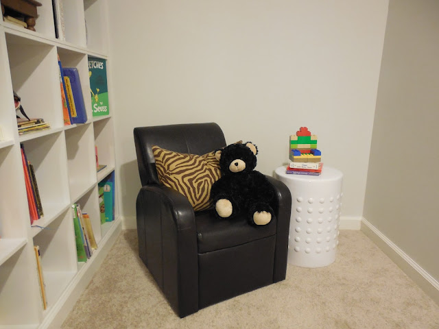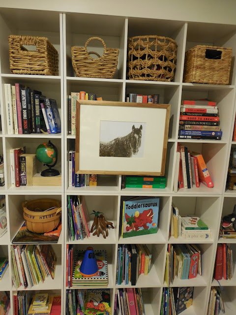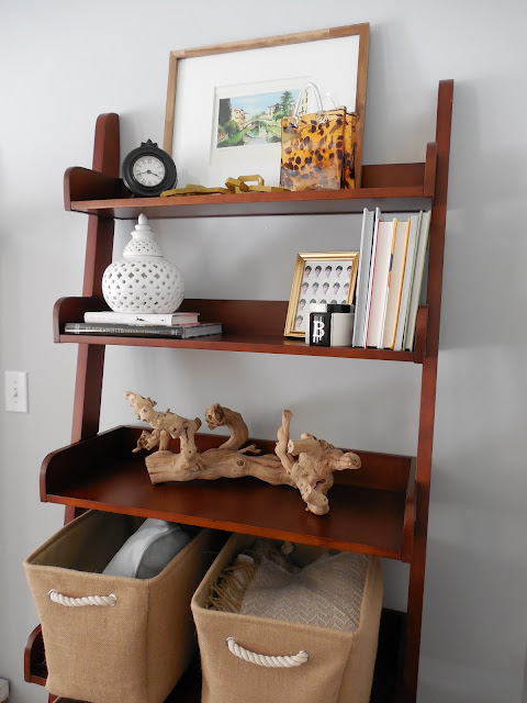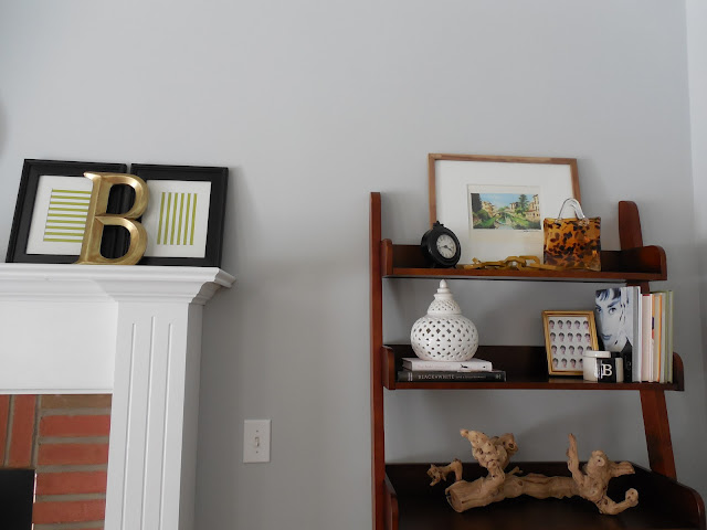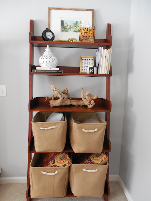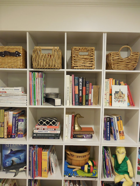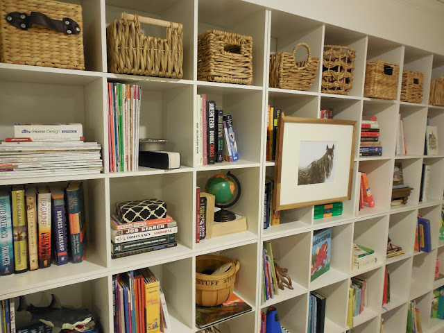 Today, I styled the shelves seen behind the sectional. There is my empty slate.