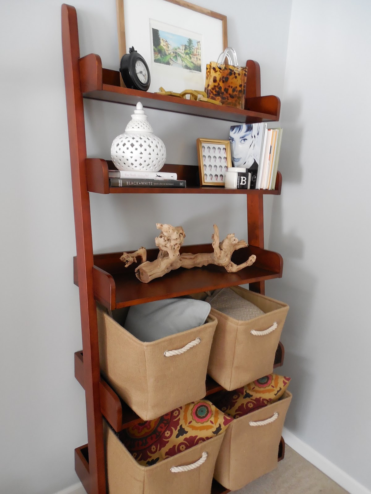 Do you like the changes? I moved the globe to the top shelf, removed some of the glass bottles and added a blue and white bowl to the small stack of blue books. We are both excited about the transformation of these shelves. And we were happy to be able to use so much of what my client already had! I know adding those personal items will be meaningful to the overall design. We are now on the lookout for two more storage bins for the bottom left shelves. I won’t necessarily match them, but find coordinating bins in a similar size. We will also add another detail to the wall space next to the globe. This room has a very high angled slope to its ceiling, so we will add a wall clock to visually draw your eye up and to also help make that tall wall feel useful.
